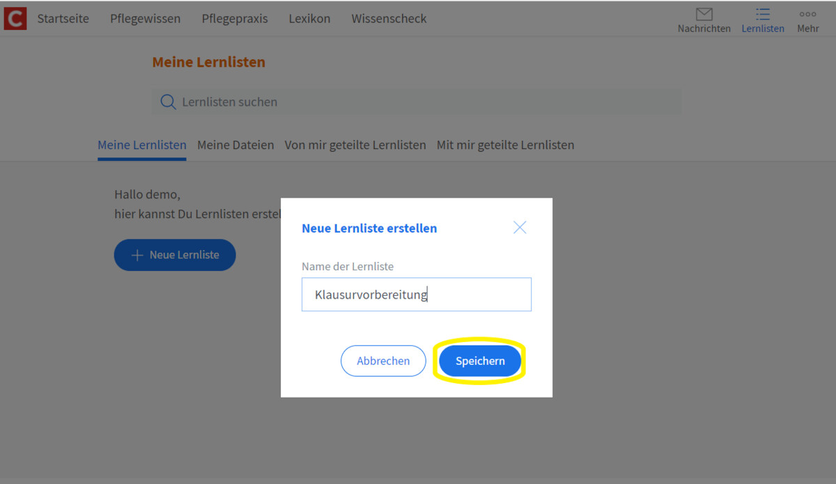 Um eine neue Lernliste zu erstellen, klicken Sie bitte auf den Button „Neue Lernliste“ und tragen einen von Ihnen gewählten Namen ein. Klicken Sie anschließend auf „Speichern“. Nun ist Ihre Lernliste erstellt und Sie können Sie in der Übersichtsliste ganz oben finden.